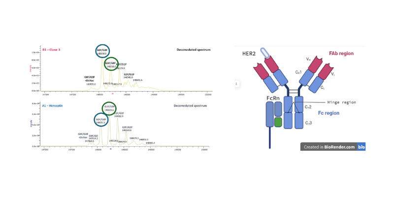 In this study on Herceptin variants, RIC and Vixen evaluated four clones alongside the originator and a degraded reference using a data-rich, integrated approach. This method enables early assessment of yield, FcRn binding potency, and Fab target affinity, combined with built-in isolation for direct structural MS analysis.